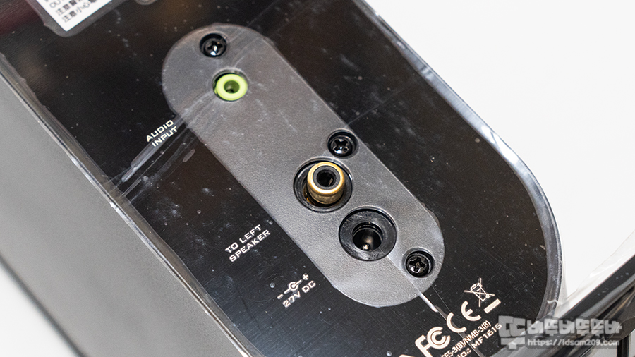 Creative GIGAWORKS T40 II 왼쪽 스피커 뒤쪽에는 제품에 메인이라 할 수 있는 오른쪽 뒤쪽에 연결하는 RCA 케이블 그리고 오른쪽 스피커 뒤쪽은 메인답게 27V DC 전원 입력 단자, 왼쪽 스피커 연결 단자 그리고 사운드 카드 출력 또는 TV나 콘솔 게임기의 사운드 출력을 입력하는 3.5mm 단자로 구성되어 있습니다.