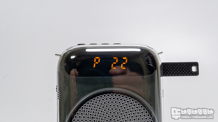 FM 라디오 모드에서는 재생/일시 정지를 길게 눌어 주파수 오토 스캔 기능으로 자동으로 주파수가 저장되면 P1~P22 식으로 저장된 채널을 표현하며 트랙 이동 버튼을 눌러 빠르게 원하는 주파수를 들을 수 있습니다.