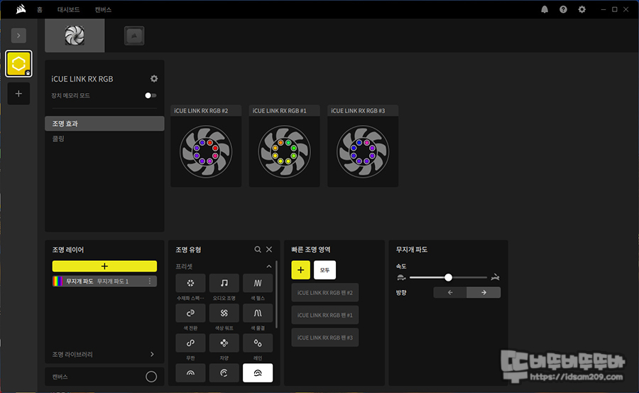 캔버스의 장치 항목에서 쿨링팬을 선택하며 메인보드의 ARGB 효과와 비슷한 iCUE LINK에 정의된 RGB LED 효과를 표현해 주며 색감도 진하게 표현되기에 만족스럽게 사용할 수 있으니 2가지 효과를 취향에 맞게 사용하시면 좋을 거 같네요.
