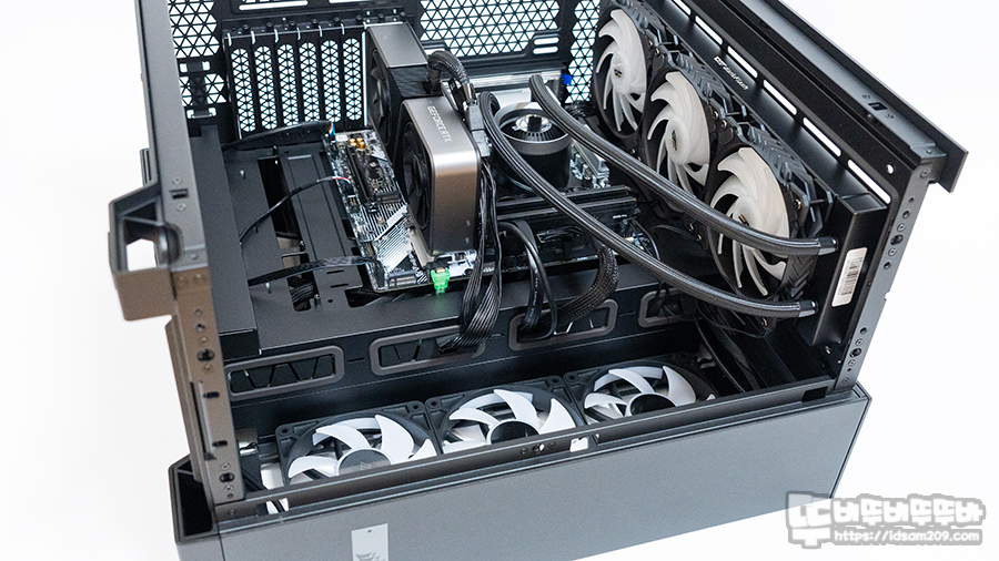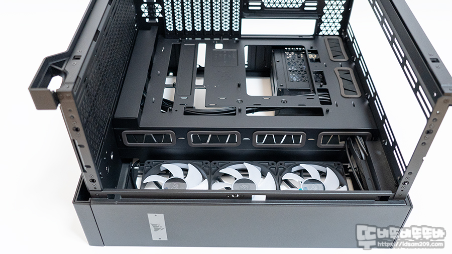 여기에 메인보드 하단에 케이블이 넘어오는 부분도 돌출된 층을 만들어 케이블이 밑에서 올라오는 디자인이 적용되었는데 이 또한 샤시면을 관통하는 케이블이 보이지 않기에 깔끔한 모습을 만들어주는데 대충 만든 거 같아 보이지만 시스템을 조립하는 과정과 완성 후 모습을 보면서 꽤 많이 신경 쓴 느낌을 받았습니다.