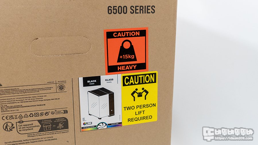 케이스가 RGB 제품인지 확인하는 방법은 측면에 RGB 컬러가 인쇄된 i Cue Link 로고가 있는 라벨 스티커를 확인해야 알 수 있으며 무게가 있어서 그런지 2명이 들어야 한다는 주의 문구가 눈에 띄는데 해외 브랜드라 그런지 안전을 강조하고 있네요.