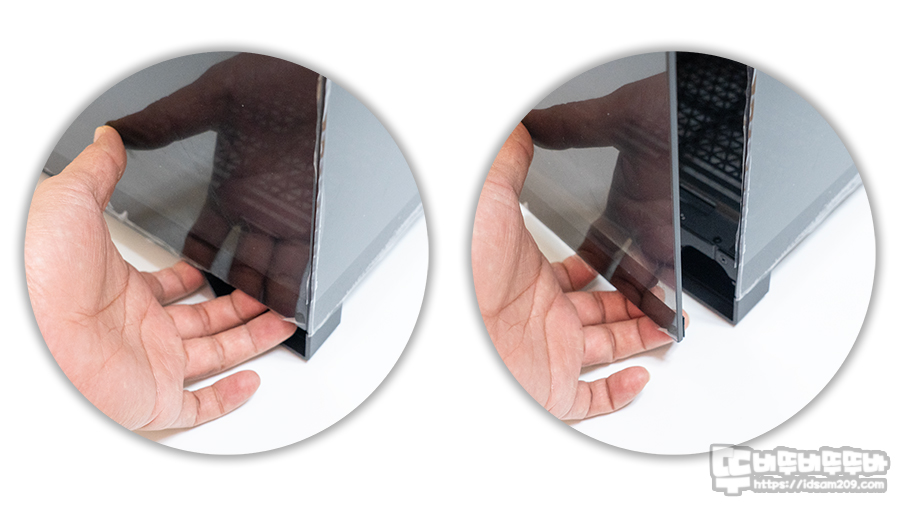 왼쪽은 케이스 상단의 타공 패널과 오른쪽은 전면 강화유리 패널입니다.