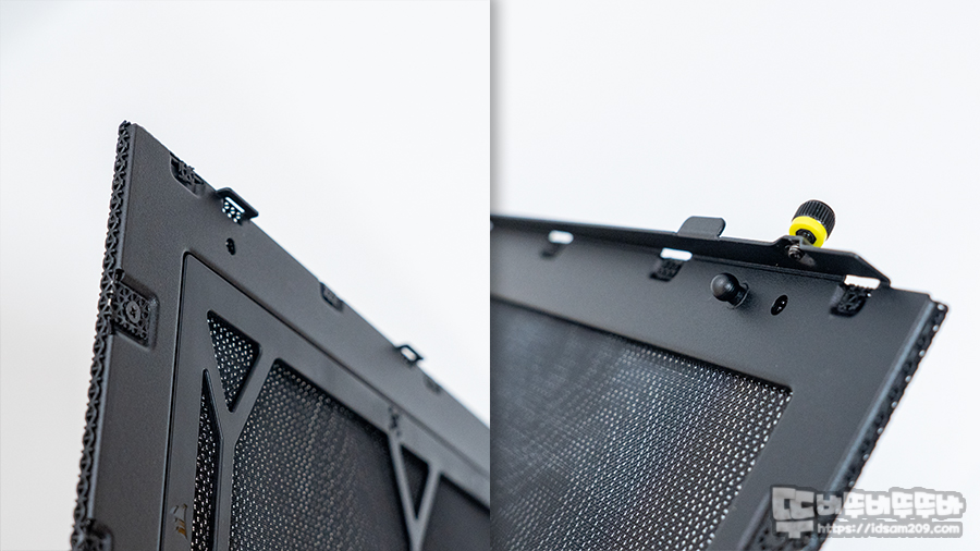 상단에 탈부착이 가능한 메쉬 필터는 앞쪽에 걸어주는 돌기가 있고 그 외에는 볼 헤드 타입의 돌기가 있어서 앞쪽에 돌기로 위치를 잡아주고 볼 헤드를 이용하여 샤시의 내부의 소켓에 딸깍하고 고정하게 됩니다.