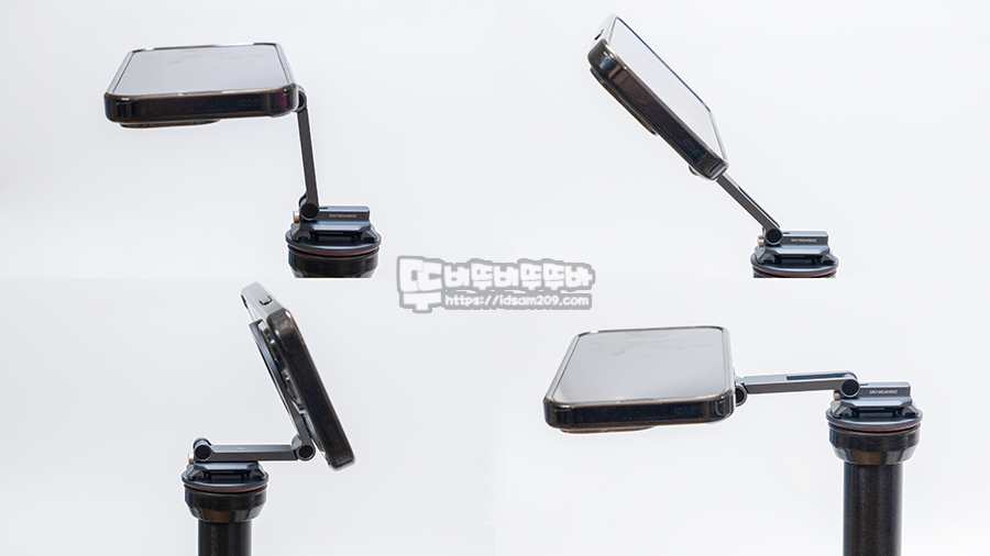 2단 관절도 되어있는 스마트폰 홀더는 위에는 240도, 아래는 180도로 앞뒤 움직임이 가능하기에 삼각대나 거치대를 사용할 때 다양한 각도에서 활용이 가능합니다.