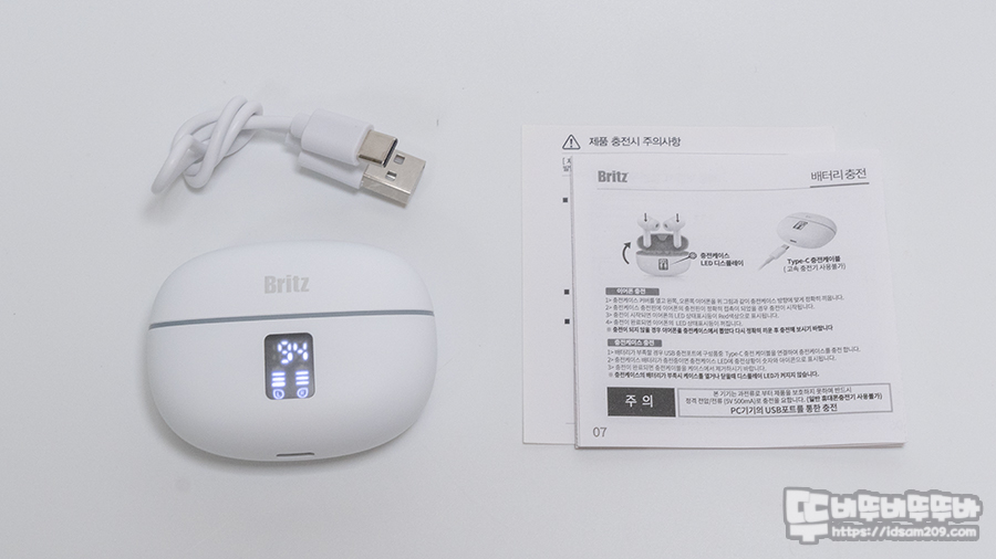 재품은 브리츠 Broad7 충전 케이스 (무선 이어버드 내장), USB-C to A 케이블, 사용 설명서로 구성되어 있습니다.