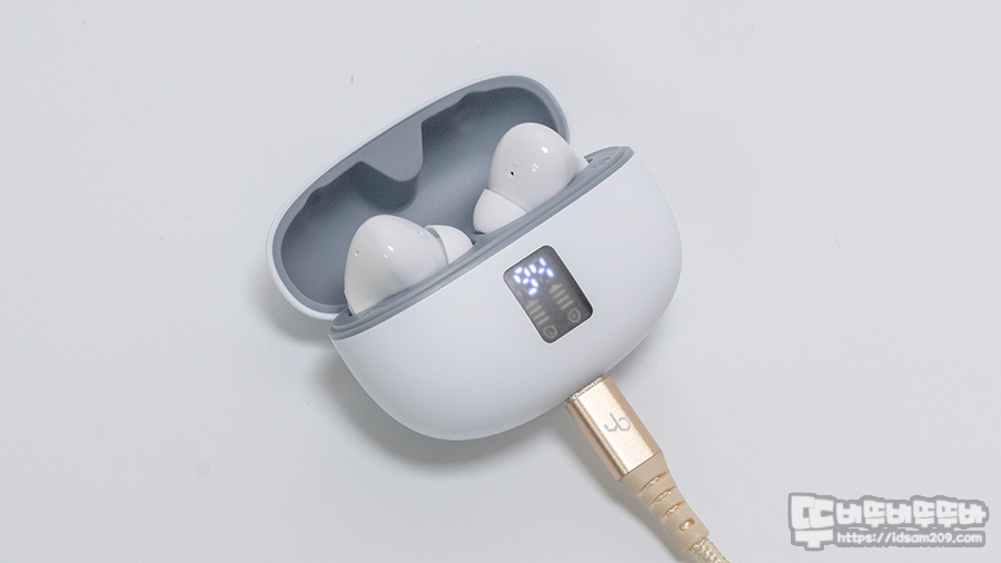 300mAh 배터리를 내장한 충전 케이스는 충전 수 숫자가 점멸하면서 % 숫자를 보여주며 완충까지 약 1.5시간이 소요됩니다.