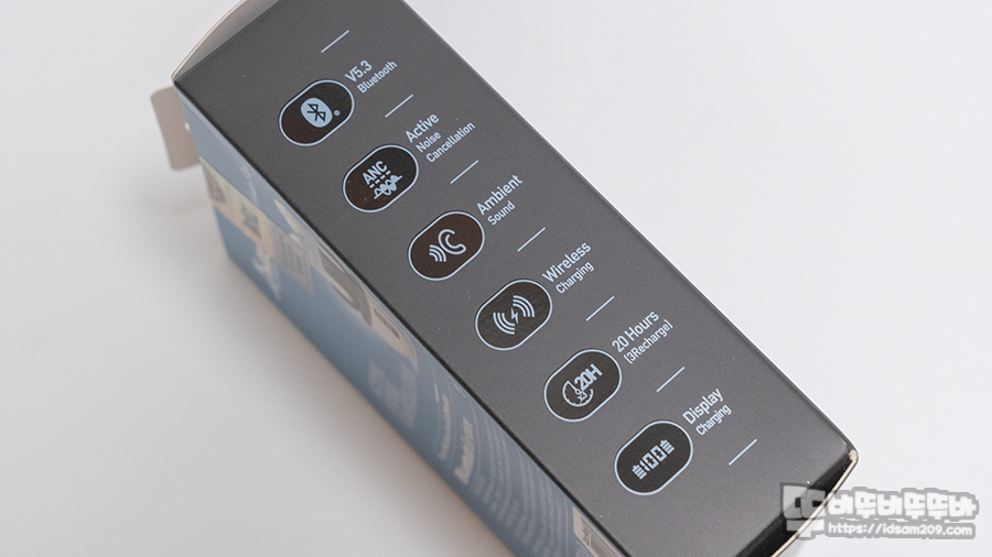 패키지에서 강조하는 내용으로는 블루투스 버전 5.3, 액티브 노이즈 캔슬링 지원, 앰비언트 사운드(주변소음 듣기) 지원, 무선 충전 지원, 충전 케이스 충전 이용 시 최대 20시간 사용, LED 디스플레이 지원 등을 확인할 수 있습니다.
