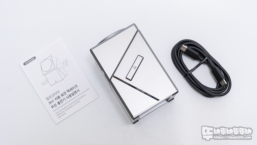 알로코리아의 UC320QI2는 아이폰, 에어팟, 애플 워치를 동시에 충전할 수 있는 3 in 1 제품으로 조금 투박해 보이는 큐브 디자인이지만 메인 맥세이프 충전 부의 회전, 양쪽에는 눌러서 튀어나오는 수납 방식으로 제품을 개봉했을 때 심플하고 심심해 보이는 디자인이지만 충전을 하기 위해서 트랜스포머 같은 변신으로 실용적인 무선 충전기 모습을 보여주는데요.