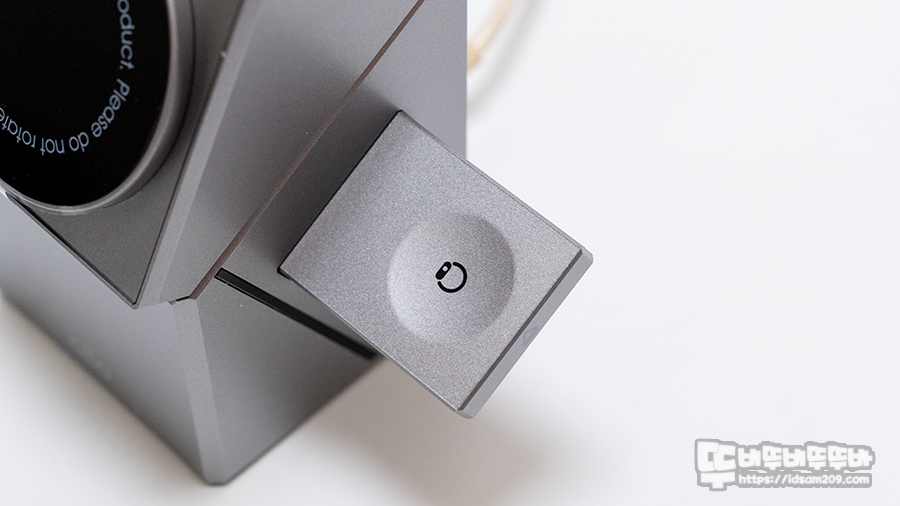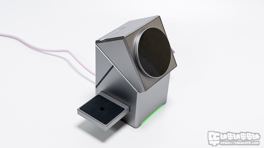 사각 큐브 형태의 디자인에 좌우에 에어팟, 워치 충전이 가능한 충전 부를 수납하고 있으며 전면 부의 터치 센서를 터치해 주면 180도 회전을 하여 맥세이프 충전 부를 Face ID 사용에 최적화된 각도를 만들어 주는 게 특징입니다.