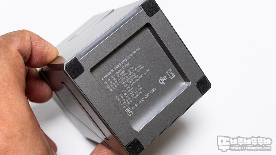 제품 스펙 정보로는 정격 입력 DC 5V/3A(15W), 9V3A(27W), 스마트폰 5W, 15W Max, 무선 충전 이어폰, 워치 2.5W Max, 크기 66 X 105 X 66mm, 무게 286g 그리고 ABS 플라스틱 하우징 베이스에 맥세이프 원형 부분에 강화유리를 사용한 조금 독특한 구성을 확인할 수 있습니다.