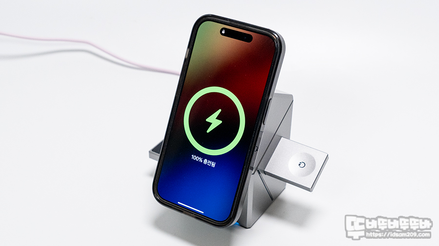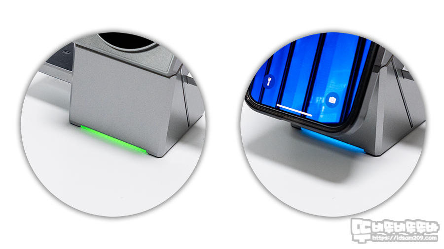 최초 전원이 공급 시 그린 LED로 작동상태를 확인할 수 있으며 아이폰을 충전하는 경우 블루 LED로 작동하여 LED 컬러에 따른 작동상태를 확인 가능하며 기존 애플의 MFM 비인증 제품은 7.5W로 제한되었으나 Qi2 적용으로 15W 고속 충전이 가능하여 빠른 무선 충전으로 편리하게 사용할 수 있었습니다.