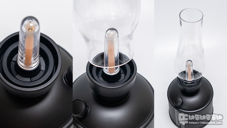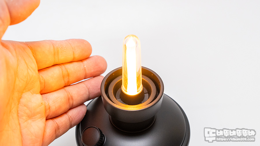 레트로 랜턴의 기름을 주입구를 그대로 살린 디자인에 주입구 뚜껑 부분을 회전하는 토클 스위치가 적용되어 블루투스 스피커 전원과는 상관없이 노브를 돌려 탁! 하고 켜고 계속해서 돌리면 LED 랜턴이 밝아집니다.