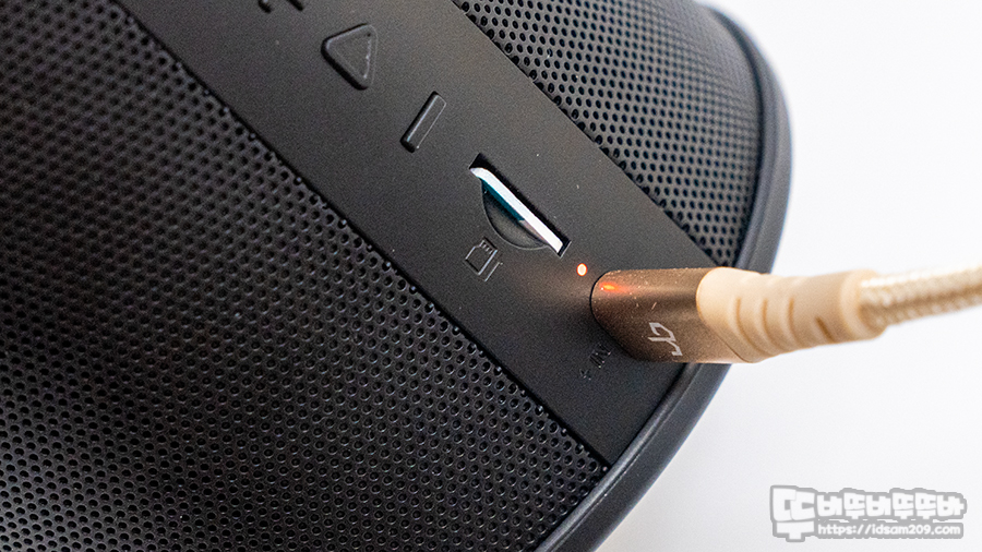컨트롤 기능은 전원 버튼 / 모드 변경(블루투스/MicroSD), 볼륨/트랙 이동, 재생/일시 정지 컨트롤 그리고 MicroSD 메모리 슬롯, USB-C 전원 단자로 구성되어 있고요.