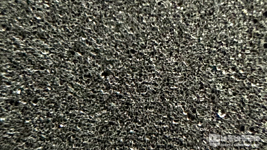 확대경으로 확대를 해보면 발포폼 모습을 확인할 수 있듯이 책상 위에 올려 넣고 사용할 때 마우스만 움직이는 부분에서는 고정력이 좋은 편이지만 손바닥으로 지그시 누르고 좌우로 드래그를 하면 살짝 밀리는 경향이 있습니다.