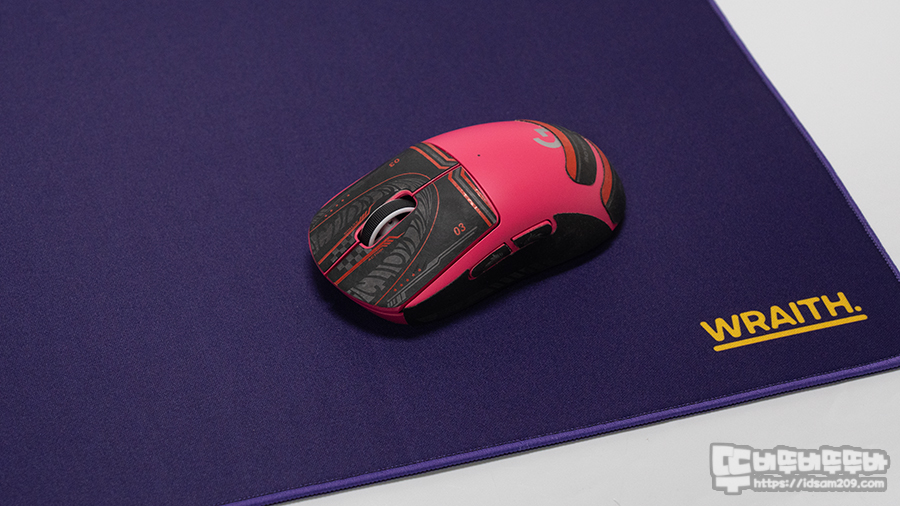 마우스 패드 우측 하단에 인쇄된 WRAITH 로고는 패드 표면 패브릭에 열가공처리로 인쇄되어 만져지진 않습니다.