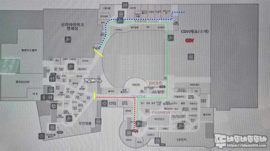 10시 30분이 도착하여 셔터가 올라가니 건베 직원이 오픈런 장소는 여기가 아니라 반대편이라고 하는데 무슨 말인지 이해가 안 되었는데 나중에 알고 보니 녹색라인으로 CGV 뒤쪽으로 가야 오픈런 줄 서는 장소를 확인할 수 있었습니다.