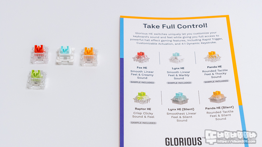 Glorious GMMK 3 PRO HE는 Hall effect (HE)를 지원하는 Fox 스위치를 기본으로 탑재하고 있지만 샘플로 제공하고 있어 스위치를 선택하는데 도움이 되는데요.