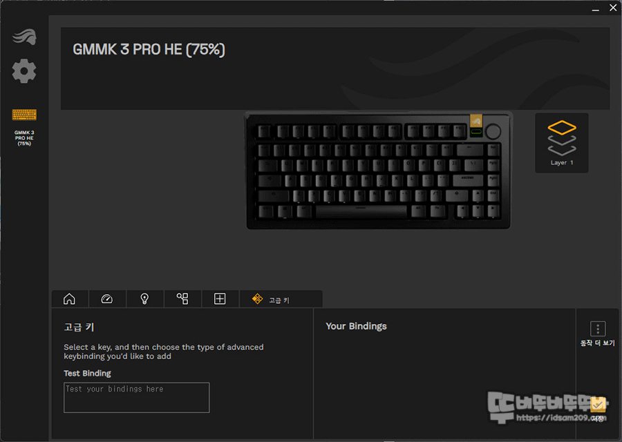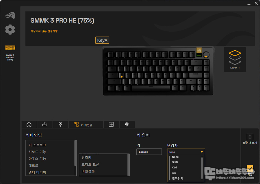 키 바인딩 메뉴에서는 키 기능을 변경하는 키 스트로크, 키보드 기능, 마우스 기능, 매크로 기능, 멀티미디어 기능 등 다양한 설정이 가능한데 키 입력 방식이 아닌 메뉴 선택 방식이라 조금 불편한 편입니다.