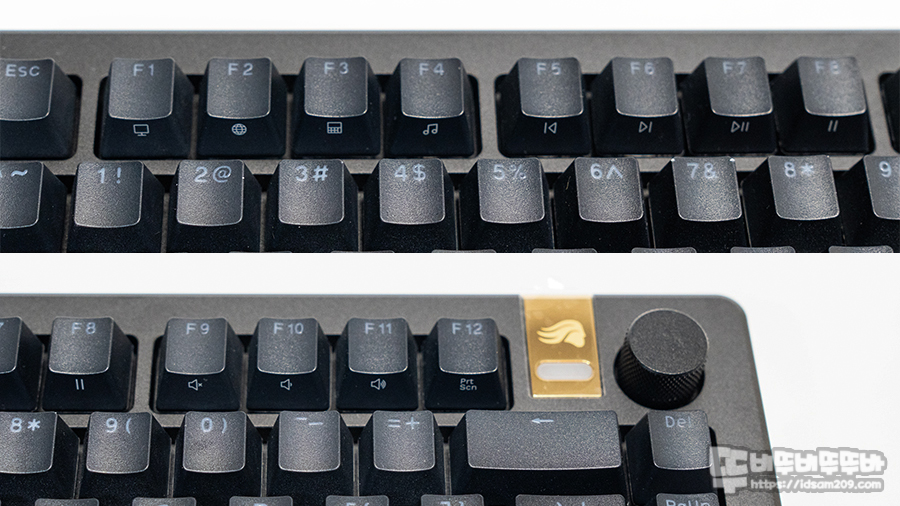 GMMK PRO와 GMMK 3 PRO HE 변화된 부분이라면 F12 키와 노브 사이에 탈부착이 가능한 Gold 컬러 포인트 뱃지 디자인과 문자열 라인에 맞춘 방향키와 모디키 디자인을 꼽을 수 있네요.