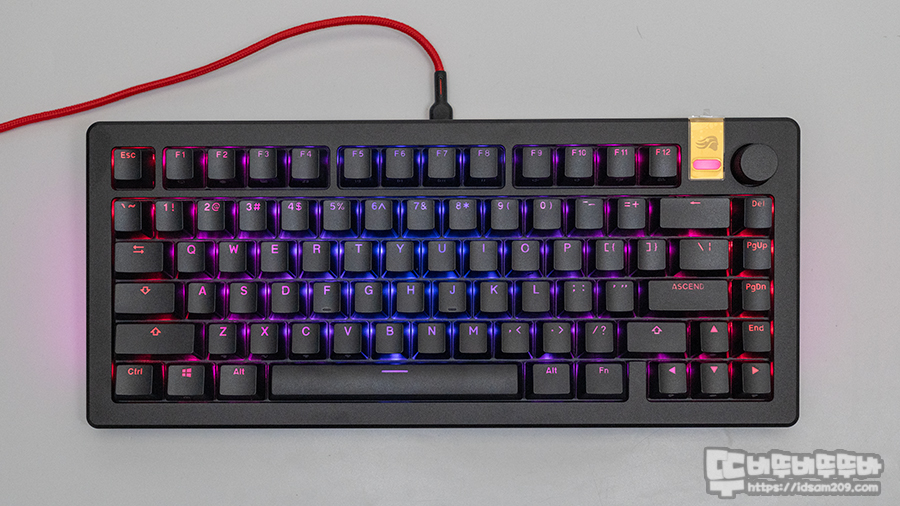 그런 이유로 키캡 각인의 LED 표현의 극대화를 위해 각인의 위치가 키캡 위쪽에 있으며 빛이 확산하는 방식이 적용되어 생각보다 밝게 표현되는 부분이 좋았습니다.