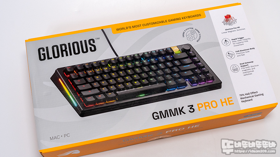 글로리어스 Glorious GMMK 3 PRO HE 75% Prebuilt 키보드 패키지는 제품의 이미지와 래피드 트리거, 풀 알루미늄 하우징, 자석축과 기계식 스위치의 듀얼 핫스왑 지원을 강조하고 있습니다.