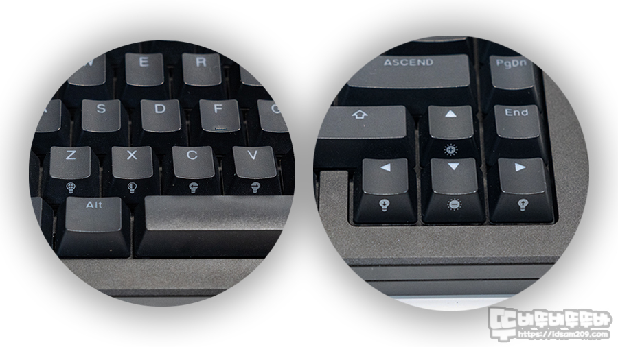 이색 사출이 적용된 PBT 키캡은 각인 부분인 반투명 소재가 적용되어 LED 빛 투과에 특화되었으며 Fn 조합으로 사용되는 키는 측각 실크인쇄로 표현하고 있습니다.