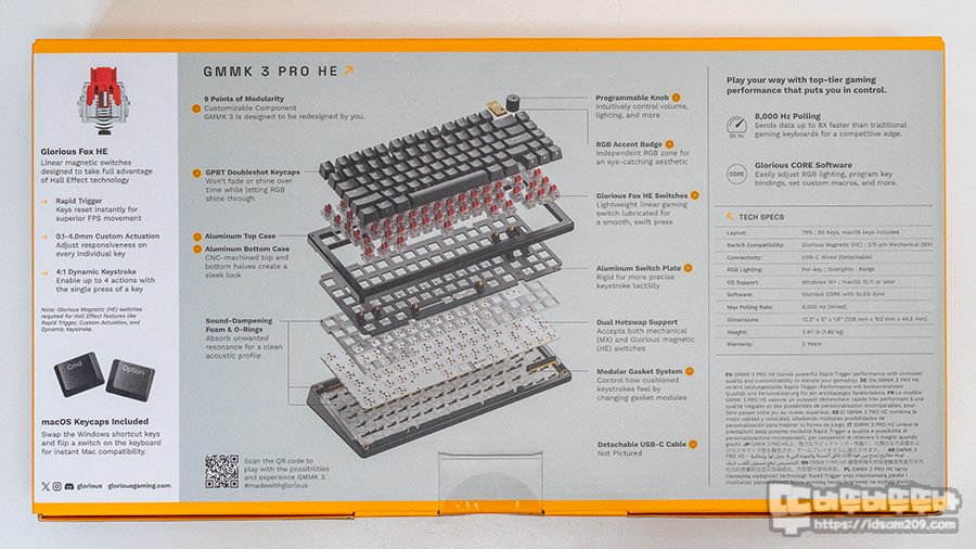 홀 이펙트(HE)를 지원하는 글로리어스 Fox HE 스위치 적용으로 래피드 트리거 지원, 0.1~4.0mm 입력 지점 지정, 한 개 키에 4가지 액션 적용이 가능한 다이나믹 키 스트로크 그리고 Mac OS 키캡 동봉.