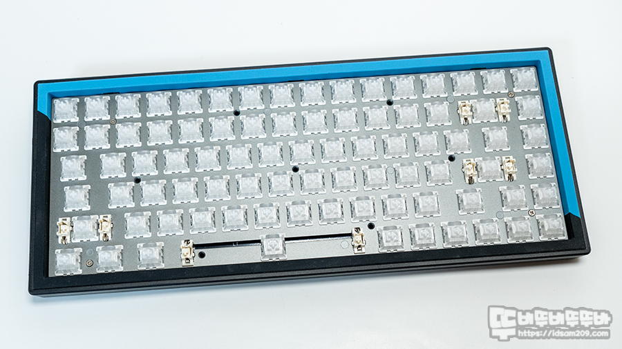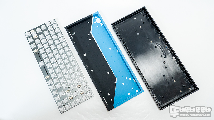 제품은 하판 바닥면에 나사가 없으며 키캡을 모두 제거 시 알루미늄 보강판 모서리 부분에 4개의 나사로 고정하고 있는데요.