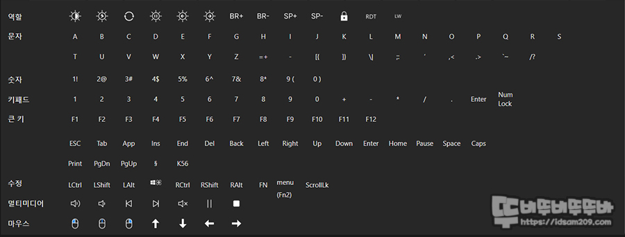Fn 키 조합으로 사용하는 기능으로는 Fn + F1 이전 트랙 / Fn + F2 다음 트랙 / Fn + F3 재생, 일시 정지 / Fn + F5 음소거 / Fn + F6 / F7 볼륨 조절 그리고 Fn + Prisc : Pause / Fn + Ins : ScrLk 기능으로 구성되어 있고요.