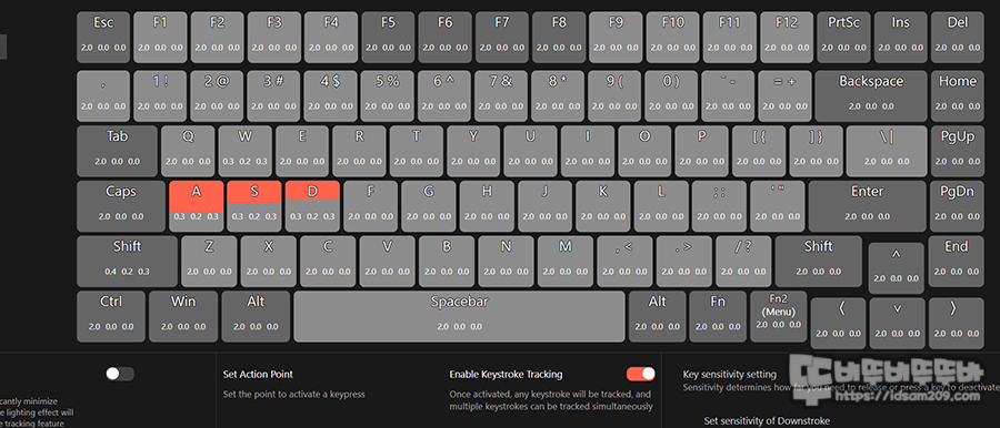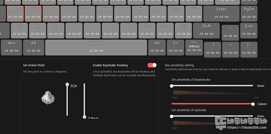 입력 지점은 0.2~3.8mm, 키 입력 감도는 0~3.6mm 범위에 내에서 설정이 가능하니 여러 가지 값을 설정해 보시고 잘 맞는 값을 찾으시기 바랍니다.