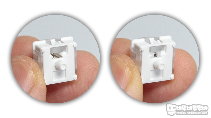 레이샤 자석축 스위치는 스위치 스템 측면에 자석이 부착되어 스템 중앙에 부착된 보통의 자석축과 다른 모습을 보여줍니다.