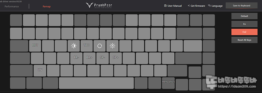 리맵 메뉴는 키보드 키 기능을 설정하는 메뉴로 기본 키 , Fn 키, Fn2 기능을 변경하거나 추가할 수 있습니다.