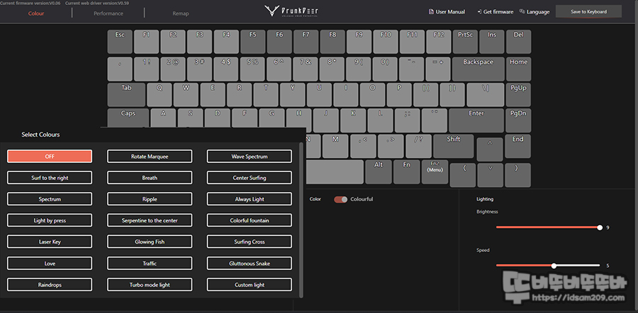 키보드 자판에는 오른쪽 Ctrl 각인이 되어있지만 이 부분은 Ctrl 기능이 아닌 Fn2 기능으로 설정되어 있어서 위와 같이 Q : RDT On/Off, Z : LW On/Off, R : 백라이트 LED On/Off, T : 터보 모드 On/Off, U : LED 효과 선택, Y : 컬러 변경, F/G : LED 효과 밝기 조절, H/J : LED 효과 속도 조절 기능으로 사용할 수 있었고요.