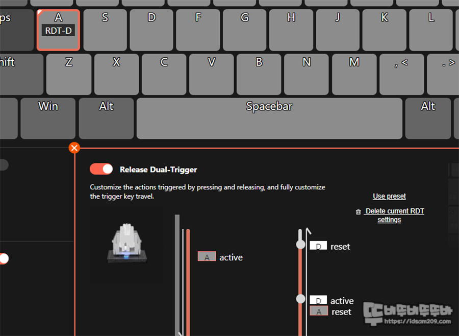 특히 이 기능을 이용할 때 Active에 기본 키를 선택하고 Reset에 서브 키를 입력 후 꼭 "Save current key RDT setting"를 눌러 저장을 해야 기능이 적용된 해당 키에 RDT 마킹이 표현됩니다.