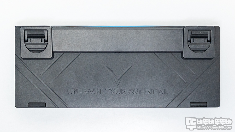 키보드 하판은 이전 모델과 동일한 높이 조절 다리와 미끄럼 방직 패드가 하우징 안으로 움직이면서 충격을 완화해 줍니다.