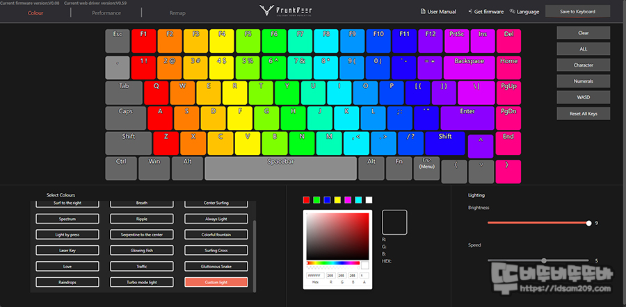 웹 소프트웨어의 첫 메뉴는 RGB LED 효과를 선택하는 메뉴로 다양한 LED 백라이트 효과를 선택하거나 커스텀 라이트 설정으로 나만의 효과를 선택할 수 있습니다.