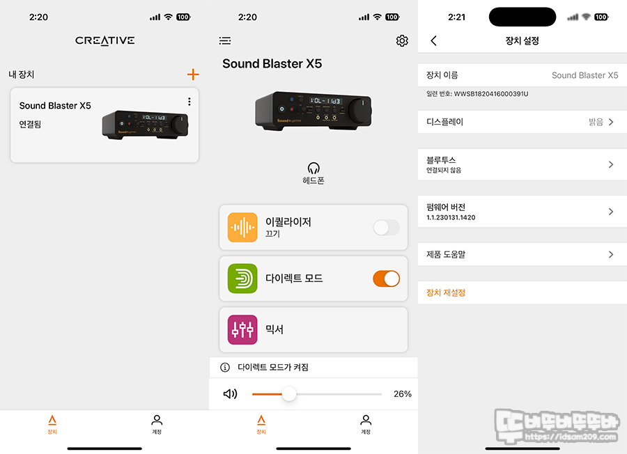 Creative 모바일 앱을 설치하면 PC 앱보다는 간략하지만 이퀄라이저, 다이렉트 모드, 믹서 기능을 사용할 수 있으며 블루투스 연결과 디스플레이 밝기 선택도 가능합니다.
