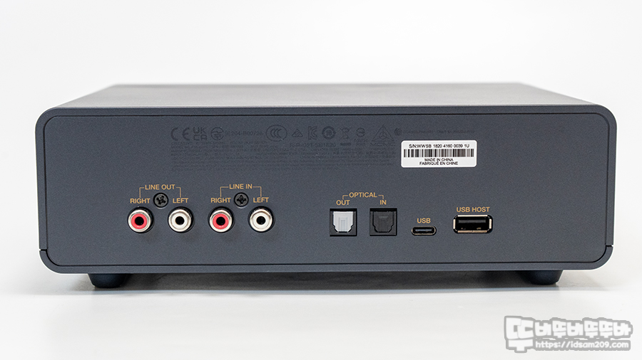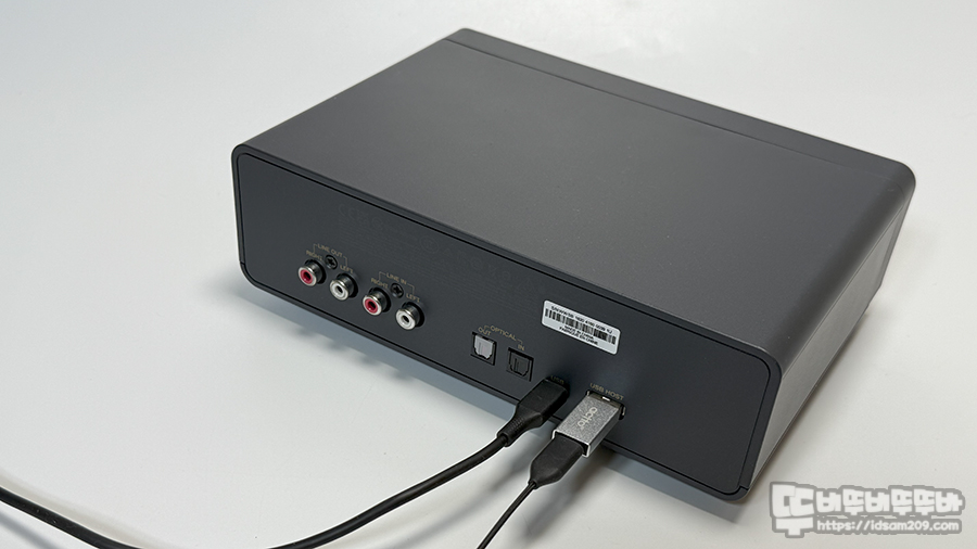 제품 뒷면에는 USB 전원 단자를 기본으로 RCA 입력과 출력, 광 입력/출력 그리고 USB-A Host 단자로 구성되어 있네요.