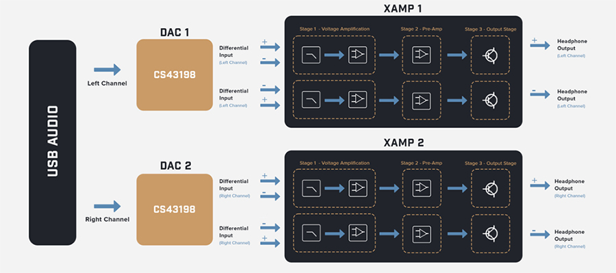 앰프 회로 내부의 간섭으로 인한 잡음을 제거하기 위해 시러스로직 CS43198 DAC 컨버터 칩셋과 Xamp를 듀얼로 구성하여 왼쪽 및 오른쪽의 오디오 신호를 독립적으로 증폭하며 PCM을 통해 32비트/384kHz 고해상도 음원 재생이 가능하며 DoP128 및 DSD256의 오디오 형식을 디코딩 지원합니다.