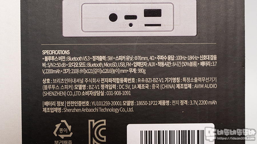 블루투스 5.3 / 스피커 유닛 76mm 5W 출력 / 주파수 응답 100Hz~18kHz / 신호대 잡음비 S/N ≥50 dB / 입력 모드 : 블루투스, MicroSD, USB, FM 라디오, AUX 입력 / 배터리 내장 2,200mAh / 충전 시간 : 4시간 / 작동 시간 8시간 (50% 볼륨) / 크기 210 (가로) X 121(세로) X 128.6mm(높이) / 무게 950g 등의 정보를 확인할 수 있고요.