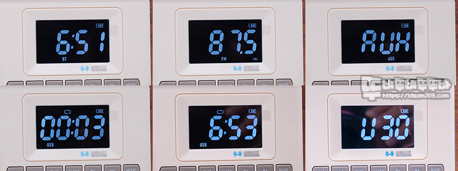 테스트를 위해 제품 뒷면에 I/O 포트를 통해 AUX 입력, USB 메모리, MicroSD 카드를 모두 꼽고 LED 디스플레이의 정보 표기를 확인해 보았습니다.