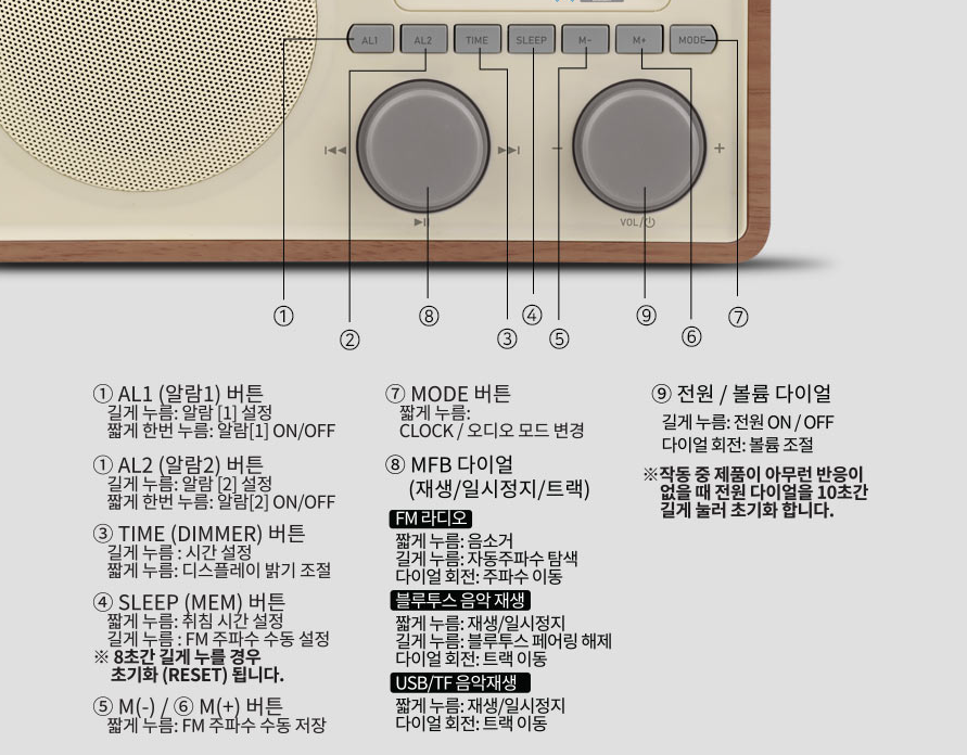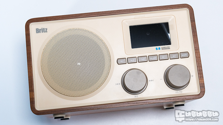 브리츠 BZ-V1 우드 인클로저에 스킨을 더해 나무 느낌을 주고 있으며 전면에 큼지막한 스피커와 LED 디스플레이, 두 개의 회전 노브와 기능 버튼 구성은 클래식한 느낌과 현대적인 느낌을 잘 믹스한 느낌입니다.