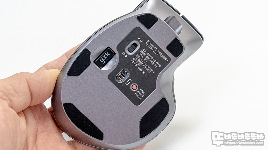 제품의 바닥면에는 무선 리시버를 수납할 수 있는 공간과 On/Off 스위치 그리고 Windows와 MAC1, MAC2 운영체제를 선택할 수 있는 선택 버튼으로 구성을 확인할 수 있고요.