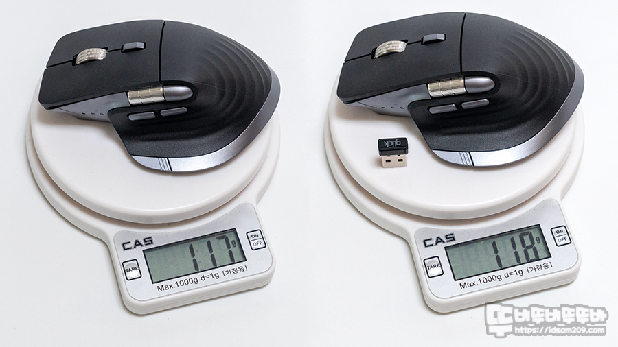 제품 스펙의 무게 119g보다는 차이가 있지만 무선 리시버가 없는 마우스는 약 117g, 무선 리시버 포함 시 약 118g으로 50g 전후로 출시하는 빠른 마우스 무빙을 필요로 하는 게이밍 마우스보다는 조금 무거운 편이지만 최대 4000 dpi 사용할 수 있어 웹서핑이나 오피스 용으로 안성맞춤입니다.