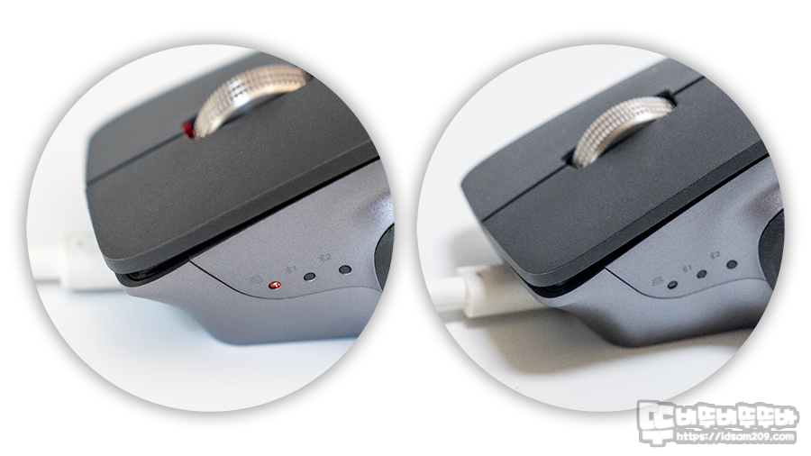 마우스 측면에는 RF무선, 블루투스 1, 블루투스 2 연결을 표현하는 LED 인디케이터를 확인할 수 있는데 LED 인디케이터는 무선 연결 표현과 DPI 단계 표현을 겸하며 연결된 LED를 1~5 단계 점멸로 현재 사용하는 DPI를 확인할 수 있습니다.