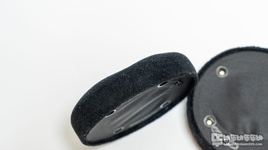 벨벳 소재로 덮여있는 이어패드 내부에는 밀도가 높은 메모리폼을 사용하고 있어 통기성과 쿠션감이 좋은데 제품을 받고 1주일 동안 하루 평균 4시간 정도 착용했는데 귀를 누르고 땀 차는 느낌이 없어서 쾌적하고 좋았습니다.