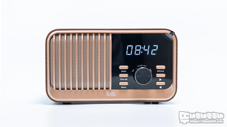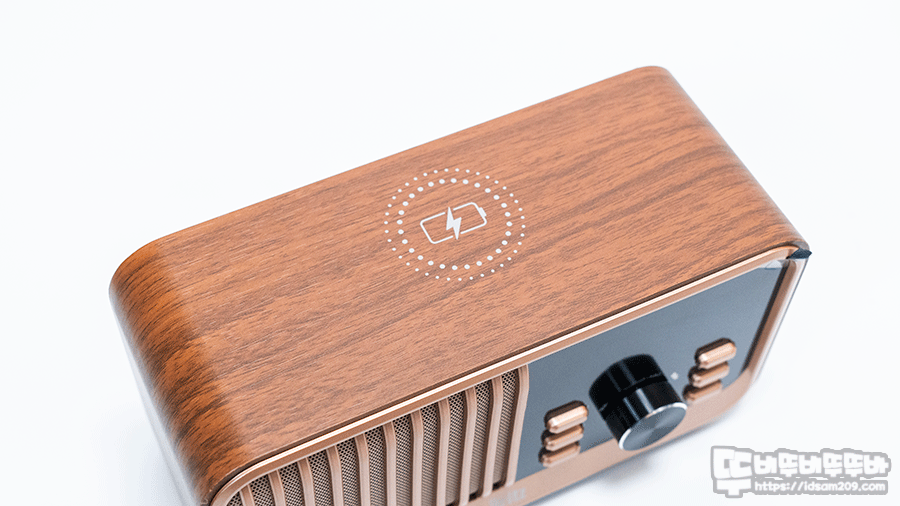 브리츠 BZ-JE100는 레트로 디자인의 스피커 그릴과 목재 느낌의 외형에 무선 충전은 지원하는 올인원 블루투스 스피커로 인테리어 오브제로 상당히 리트가 있는 제품인데요.