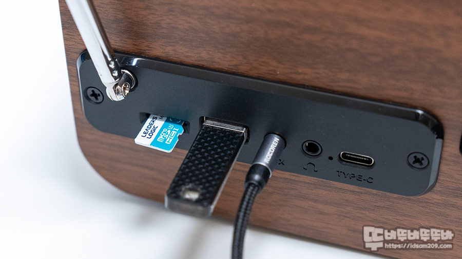 올인원 제품답게 MicroSD 메모리, USB 메모리, AUX 라인 입력, 헤드폰 출력 외 블루투스와 FM 라디오 등 다양한 입력과 헤드폰으로 출력이 가능한 단자를 제공하여 활용도가 좋습니다.