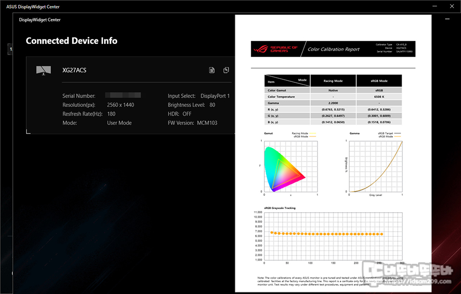마지막으로 디바이스 정보에는 해상도와 주사율, 입력 포트, 밝기, HDR 사용 여부 및 상용 중인 Game Visual 모드 정보를 보여주며 우측 상단에 문서 모양을 클릭하면 팩토리 켈리브레이션 리포트 정보를 확인할 수 있습니다.
