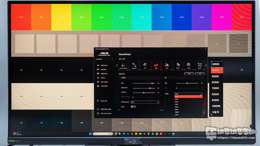 색온도 조절을 따뜻한 4000K를 시작으로 5000K / 6500K / 7500K / 8200K / 9300K / 10000K 순으로 점점 푸른 느낌으로 밝아지는 색감을 디테일하게 선택할 수 있습니다.
